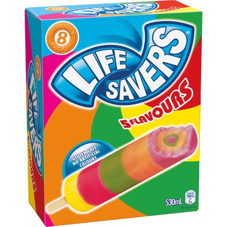 Life Savers are a refreshing combination of 5 fruit flavours; blackcurrant, orange, lime, raspberry and pineapple – just like the original Life Savers 5 Flavours lollies! With only 40 calories per serve and gluten free, it’s fun treat for the whole family!