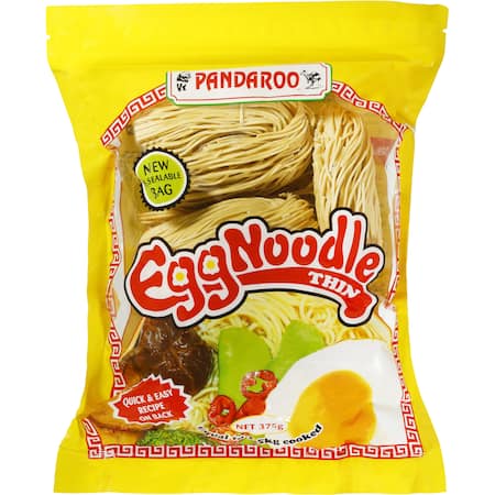 Pandaroo Egg Noodle Thin with a new re-sealable pack and equal to 1.5g cooked.