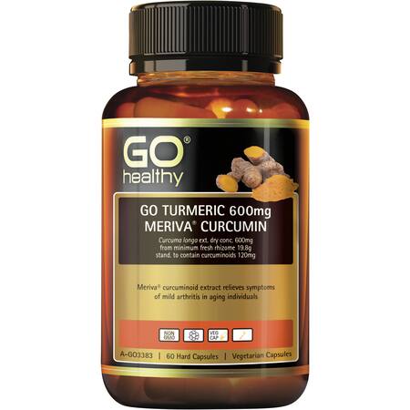 GO TURMERIC 600mg MERIVA® CURCUMIN has been created using the patented ingredient Meriva®, formulated to assist absorption. Turmeric relieves symptoms of mild arthritis in aging individuals, reducing mild joint stiffness, aches and pains and support mobility. Curcuminoids reduce free radical damage in the body by acting as an antioxidant.