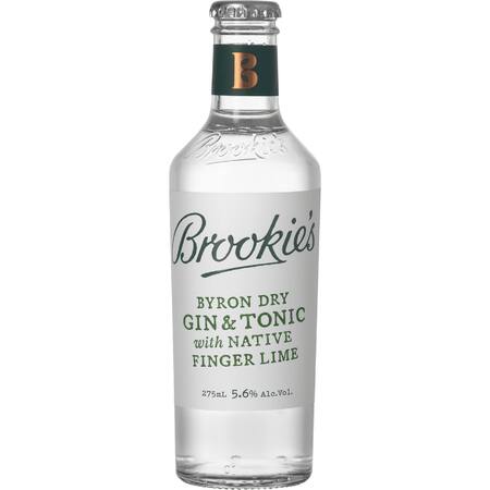 Enjoy award winning Brookie's Byron Dry Gin pre-bottled with bespoke, premium low sugar Tonic and Native Finger Lime. The mouthfeel and experience is a super refreshing light take on a classic Gin and Tonic. An array of Brookie’s botanicals rise to greet your nose, while light bright citrus notes dance on the pallet with a semi-dry refreshing finish.
