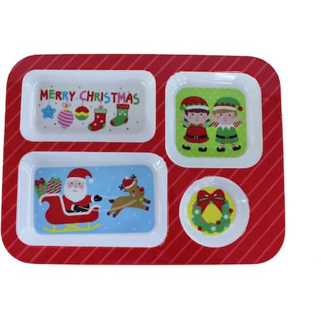 The kids melamine 4 sections Plate with Santa and Elf design is perfect for a Xmas Party. Cup is available to complete a set. Dimension: 30.3cm x 22.8cm x 1.9cm Material: Melamine