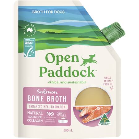 OPEN PADDOCKâ„¢ Salmon Bone Broth is intended as a complementary food, not a complete and balanced meal.