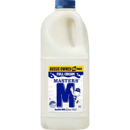Homogenised & pasteurised milk full cream with 8 nutrients. Permeate free. Proudly WA.<BR><BR>At the Masters Dairy in Bentley, we've been proudly supporting WA dairy farmers and making quality milk products since 1959.<BR><BR>Australian milk<BR><BR>Fresh milk<BR><BR>From Australian farmers<BR><BR>Rich in calcium<BR><BR>Natural source of protein<BR><BR>High quality<BR><BR>Nutritious and delicious milk