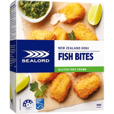 Hoki Fillet Bites (50%), Gluten Free Crumb Coating (50%) (Water, Vegetable Oils, Rice Flour, Maize Starch, Thickeners (450, 1404, 415, 412), Rice Bran, Maltodextrin, Yeast, Salt, Garlic Powder, Onion Powder). CONTAINS:Fish