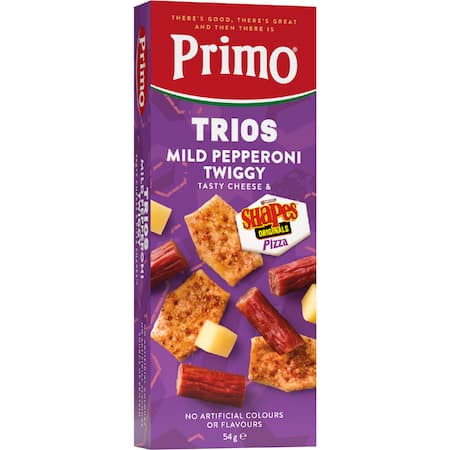 Delicious Primo Pepperoni Twiggy Bites, Tasty Cheese and Arnott's Pizza Shapes.