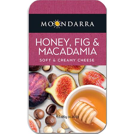 Australian made and Australian owned, Moondarra Honey, Fig & Macadamia 120g is a generous quantity of dried figs encased in smooth, honey flavoured cream cheese, surrounded by roasted macadamias.