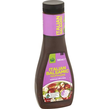 Woolworths Select Italian Balsamic Salad Dressing contains no artificial flavours and is 99% fat free.