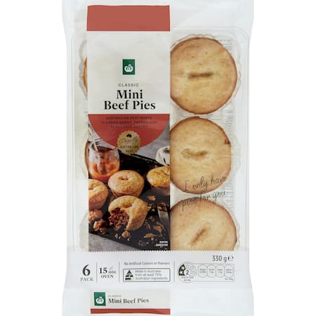 Australian Beef (25%), Wheat Flour (Wheat Flour, Thiamin, Folic Acid), Water, Margarine (Fractionated Palm Oil, Emulsifiers (471, 472c), Antioxidant (304), Natural Flavour, Natural Colour (Carotene)), Fractionated Palm Oil, Onion, Tapioca Flour, Carrot, Celery, Tomato Paste, Thickener (1450), Natural Colour (Caramel I), Vegetable Stock Powder, Yeast Extract, Garlic, Worcestershire Sauce (Acidity Regulator (Citric Acid)), Canola Oil, Egg, Baking Powder (Raising Agents (450, 500), Wheat), Vinegar, Sugar, Garlic Powder, Onion Powder, Natural Butter Flavour (Milk), Salt, Milk Powder, Spices