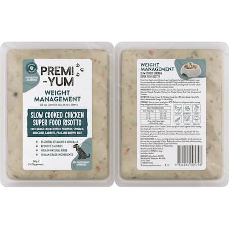 Premi-Yum slow cooked chicken super food risotto for dogs is formulated to meet the nutritional levels established by the AAFCO dog food nutrient profiles for adult ,maintenance. All the essential vitamins and mineralsyour dog needs in a lower calorie meal and with added fibre for increased satiety.