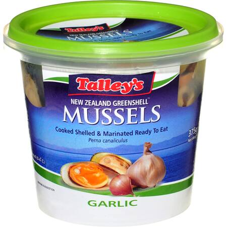 Talley's Chilled Mussels Marinated Garlic cooked shelled & marinated ready to eat.