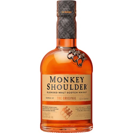 Monkey Shoulder is a premium Scotch Whisky that is steeped in history and culture and to this day is still tended by hand by the experienced Malt Men of Speyside. A smooth and rich 'triple' malt Scotch (a world first!) that has been blended from three of Speyside's finest single malts and using batches from only 27 casks to produce this fine malt whisky. A delightful nose of sherry, cinnamon baked pear, butterscotch, barley, strawberry and Bourbon vanilla which are all complemented by tangy, sweet nut, citrus, mint, oak and orange peel flavours. TASTING NOTES: Mellow vanilla with sweet cooking spices. SERVING SUGGESTION: Fill a tall glass with Ice. Pour in Monkey Shoulder whisky and dry ginger ale. Gently stir and garnish with an orange wedge.