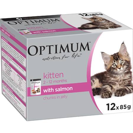 OPTIMUM™ Kitten with Salmon Chunks In Jelly Wet Cat Food 85g Pouches are made with real meat and high quality protein sources, providing your kitten with the optimal level of nutrition and the taste they love.