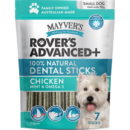 Our NEW Mayver’s Rover’s Advanced+ 100% NATURAL Dental sticks Chicken Mint & Omega 3 Dog Treats have superior cleaning action for cleaner teeth, gums and fresher breath. One stick per day is enough to help maintain your pooch's dental health. Try them today, we promise your dogs will love them!