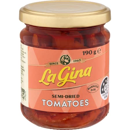 Semi-Dried Tomatoes (60%), Sunflower Oil (36%), Salt, Acidity Regulator (Citric Acid), Herbs, Garlic