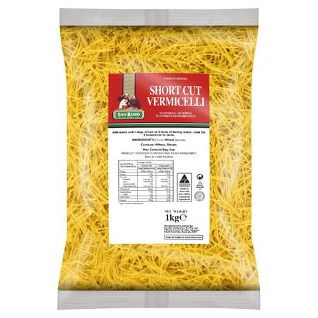 San Remo Short Cut Vermicelli 1kg is made from 100% Australian Durum Wheat and cooks in 2 minutes.
