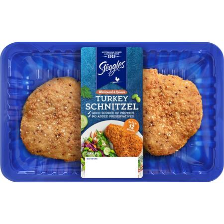 Turkey Breast (59%), Wholemeal and Quinoa Coating (31%) Wheat Flour, Wheat Bran, Quinoa Seed (0.7%), Soy Protein, Vegetable Oil, Yeast, Wheat Gluten, Wheat Germ, Sugar, Salt, Water, Wheat Starch, Modified Starch (1404), Mineral Salts (450, 500), Vegetable Gums (412, 415)), Water, Vegetable Oil, Thickener (1442), Mineral Salts (451, 450, 452). Contains: Wheat, Gluten, Soy.