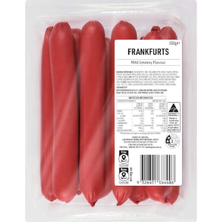 Meat Including Pork, Water, Starch (Tapioca, Potato), Salt, Acidity Regulators (325, 262), Emulsifiers (451, 450, 452), Dextrose (Tapioca, Maize), Soy Protein, Antioxidants (316, 307b), Dehydrated Vegetable, Smoke Flavour, Sodium Nitrite (250), Spices And Spice Extracts, Hydrolysed Vegetable Protein (Soy), Maltodextrin (Maize), Canola Oil, Fermented Red Rice, Colours (160c, 120, 172, 160b), Flavours (Including Smoke), Yeast Extract, Edible Casing.