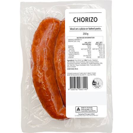 Pork (94%), Salt, Milk Powder, Stabiliser (451,450,452), Dextrose (Maize), Spices and Spice Extract, Dehydrated Vegetable, Vegetable Oil, Acidity Regulators (326,261,262,331), Sugar, Antioxidant (316), Preservative (250). Wood Smoked.