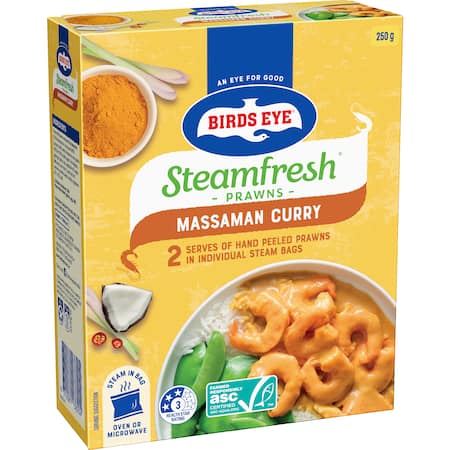 Prawns (Penaeus vannamei) (*crustacean*) (55%), Massaman curry sauce (40%) (coconut milk, water, massaman curry paste (4%) (red chili, shallot, garlic, lemongrass, galangal, spices, salt, vegetable oil), sugar, *fish* sauce, corn starch, yeast extract, tumeric powder), water, acidity regulators (451, 452), salt.