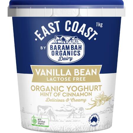 Organic Milk, Organic Milk Solids, Organic Vanilla Bean (0.6%), Organic Raw Sugar, Organic Vanilla Extract, Enzyme (Lactase), Cinnamon, Live Yoghurt Cultures (Milk).