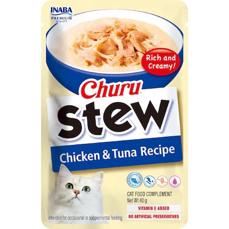 Pet treat only. Not for human consumptionTuna Broth, Chicken, Tuna, Tapioca Starch, Natural Flavors, Guar Gum, Agar-Agar, Vitamin E Supplement.