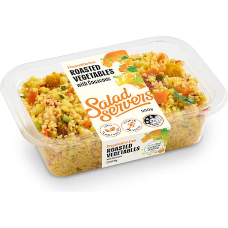 Roasted Vegetables (34%) (Carrot, Pumpkin, Sweet P otato, Cauliflower, Onion, Capsicum), Water, Cous c ous (18%) (Wheat Semolina), Canola Oil, Israeli Co uscous (6%) (Wheat Semolina), Chickpeas (5%), V ine gar, Sugar, Salt, Parsley (1%), Chilli, Spices (0