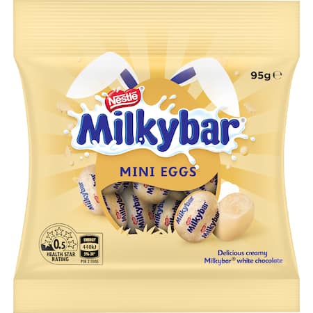 White Chocolate (52%) (Sugar, Cocoa Butter^, Milk Solids, Glucose Syrup, Emulsifier (Lecithin), Flavour), Filling (48%) (Sugar, Milk Solids, Vegetable Fats, Milk Fat, Emulsifier (Lecithin), Flavour). Contains Milk. May Contain Almond, Brazil Nut, Cashew, Hazelnut, Macadamia, Pecan, Pistachio, Walnut. White Chocolate Contains 24% Cocoa Solids and 23% Milk Solids. ^Rainforest Alliance Certified Cocoa. Find Out More at Ra.Org.