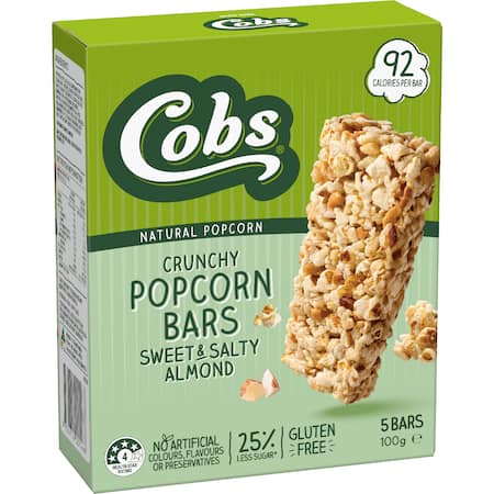Take care not to consume any unpopped corn kernels.POPCORN (20%), GLUCOSE, SUNFLOWER OR CANOLA OIL - HI OLEIC, SOLUBLE TAPIOCA FIBRE, SWEET & SALTY SEASONING (SUGAR, SEA SAL, MINERAL SALT (POTASSIUM CHLORIDE), NATURAL FLAVOURS), PEANUTS (10%), RICE BRAN PUFFS (RICE FLOUR, RICE BRAN), ROASTED ALMONDS (3.5%), SOLUBLE CORN FIBRE, SEA SALT, ANTIOXIDANT (MIXEDTOCOPHEROLS).