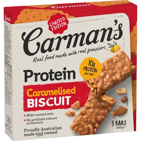 Our bars include natural ingredients and whilst every effort has been made to remove all nut shells and stones, the occasional one may be found.Caramelised Biscuit Flavoured Compound 32.5% (Sugar, Vegetable Oil, Milk Solids, Cocoa Solids, Natural Flavour, Emulsifier Soy Lecithin, Natural Colour (Paprika Extract), Salt), Protein Blend (Soy Protein Crisps Soy Protein Isolate, Tapioca Starch, Salt, Soy Protein Isolate), Glucose, Peanuts 13%, Golden Syrup, Biscuit Crumb 3% (Wheat), Vegetable Oil, Humectant (Glycerin Plant Derived), Natural Flavours, Cinnamon.