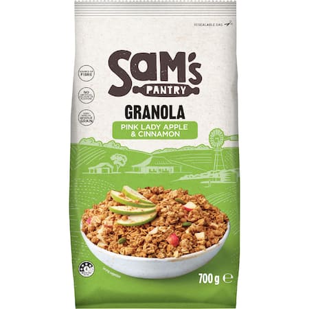 Great care has been taken to remove all shells and stones from all of our natural ingredients, however some may remain.Whole Grain Oats (59%), Glucose, Golden Syrup (Sugar, Water), Raw Sugar, Rice Puffs (Rice Flour, Sugar, Salt, Golden Syrup), Sunflower Oil, Dried Apple (Preservative (223)), Pepitas (2%), Pink Lady Apple (2%), Cinnamon (0.5%), Natural Flavour, Ginger Powder, Antioxidant (Vitamin E).