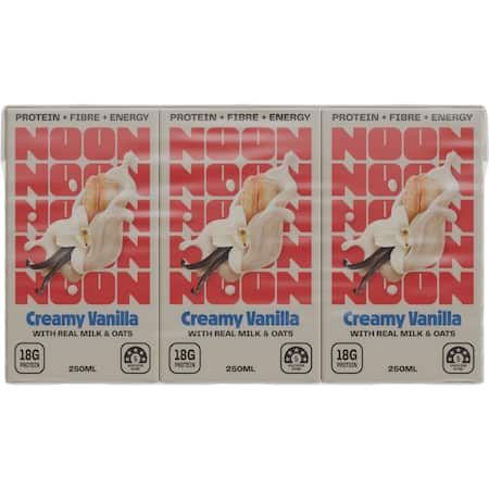Formulated Supplementary Food. NOON is intended to supplement a diet which may be low in energy or vitamins and minerals. Not suitable as a complete milk food for children under 2 years.Skim Milk (72%), Water, Milk Protein Concentrate, Coconut Milk, Banana Puree (3.5%) (Contains Ascorbic Acid, Citric Acid), Inulin, Natural Flavours, Vanilla Extract (0.5%), Oat Flour (0.5%), Mineral Salt (Potassium Citrate), Vitamins (C, B3, A, D2, B2, B1, B12, B6), Vegetable Gum (418), Natural Sweetener (Thaumatin).