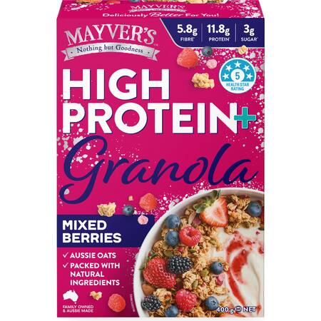 WHOLEGRAIN ROLLED OATS (44%), SOY PROTEIN CRISPS (SOY PROTEIN ISOLATE, TAPIOCA STARCH, SALT), WHEAT PROTEIN, PREBIOTIC CHICORY ROOT FIBRE, BROWN RICE SYRUP, GOLDEN SYRUP, SUNFLOWER OIL, BLACKCURRANT INFUSED RICE FLAKES (4%), PEPITAS, NATURAL FLAVOURS, SWEETENED CRANBERRIES (1%), PEANUT PASTE, TAPIOCA STARCH, FREEZE DRIED RASPBERRIES (0.3%), SALT, CITRIC ACID, ANTIOXIDANT (MIXED TOCOPHEROLS), MONK FRUIT EXTRACT.
