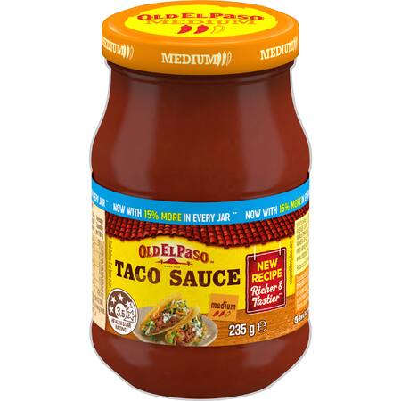 Taco sauce for topping. Diced Tomatoes (46%), Water, Tomato Paste (4%), Modified Maize Starch (1422), Dried Onions (2%), Salt, Sugar, Dried Green Capsicum (0.7%), Vinegar, Food Acid (Citric Acid), Paprika, Cayenne Pepper, Dried Jalapeno Pepper (0.2%), Firming Agent (Calcium Chloride), Chili Extract.