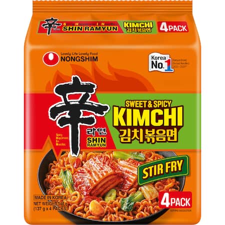 Noodles: Wheat flour, vegetable oil (contains antioxidant (307b)), potato starch, modified starch (1420), salt, acidity regulators (339, 500, 501), colour (101). Soup paste: Sugar, kimchi paste (3.4%) (vegetables, spices, rice flour, salt, soy, glucose), vegetable oil, water, onion, salt, maltodextrin, flavour enhancers (621, 627, 631), fructose, sesame oil, hydrolysed vegetable protein (soy, wheat), food acid (330), chilli pepper, black pepper, soy sauce (soy, wheat), modified starch (1442), thickener (414), yeast extract, flavours, laver, emulsifier (322 (soy)). Flakes: Dried kimchi flake (0.75%) (vegetables, salt), dried bok choy.