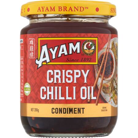 soybean oil, chilli oil (15%) (soybean oil, dried chilli), sugar, garlic, fried shallots (shallots, soybean oil), dried shrimp (crustacean), onion, dried chilli, salt, spring onion, shrimp (crustacean) paste (shrimp (crustacean), salt)