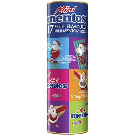 17 Fruit flavoured Mini Mentos Rolls in a Christmas Themed tube