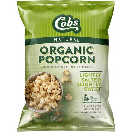 We make our delicious Cobs Organic Lightly Salted, Slightly Sweet popcorn by combining 100% certified organic corn kernels with the goodness of premium organic high oleic sunflower oil. We then pop each kernel to perfection, creating fluffy & crunchy organic popcorn. With just the right amount of organic raw sugar & sea salt, you’re left with the most delicious popcorn imaginable. Gluten Free; Plant-based; High in wholegrain; 100% sunflower oil – Never palm oil; No added MSG; Absolutely nothing artificial.
