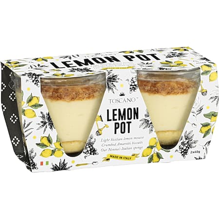 Toscano Lemon Pot contains light Sicilian lemon mousse, crumbled Amaretti biscuits, our Nonna's Italian sponge.