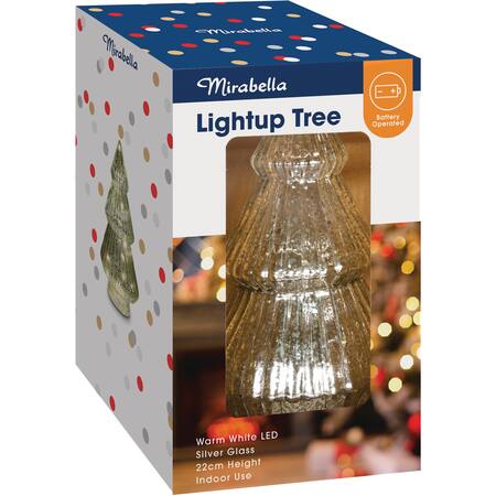 Immerse yourself in the magic of Christmas, with the Mirabella Light Up Tree. Available in vibrant green or elegant silver, this charming glass tabletop tree is sure to become a feature piece in your Christmas display. Whether you place it on a mantle, shelf, or table, it instantly adds a touch of Christmas style. Glass material, requires 2 x AAA Battery (not included), warm white LED, approx. 22 cm H, indoor use only Caution: Decoration only, this is not a toy.