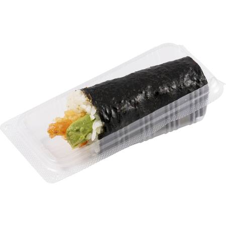 Cooked sushi rice, tempura prawn, avocado, seaweed
