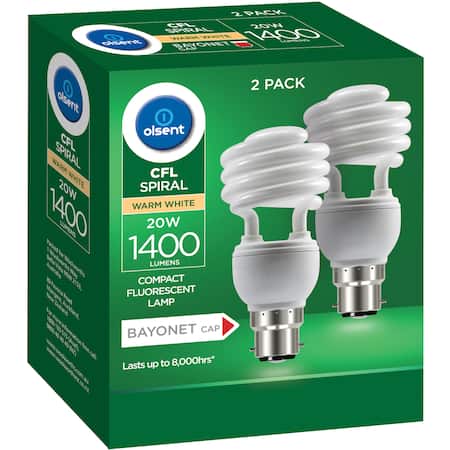 Light up your beautiful home with these multi-use petite spiral bulbs. Available in warm white, the non-directional light is perfect for creating a warm and cosy atmosphere in any room, especially lounge rooms, bedrooms or general living areas. - 20 Watts - Warm White - 2 Pack - CFL Spiral - 1400 Lumens - Compact Fluorescent Lamp - Bayonet Cap - Lasts up to 8,000hrs (Note: the actual life may vary in individual circumstances) - Voltage (V): AC 240 - Frequency (Hz): 50 - Colour Temperature: 2700K Warm White - Mercury Content: <2.5mg - Not Dimmable - Cap Type: B22d CAUTION: When inserting or replacing globes ensure power is off. Do not use excessive force. Do not grip glass tube. Grip the lamp by the base only when fitting. Keep globe dry. Not suitable for dimmers, touch lamps or other control devices.