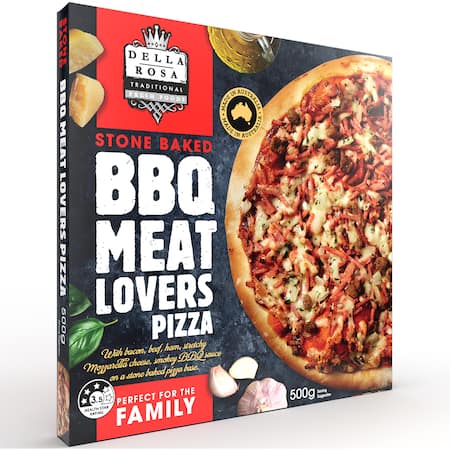 Pizza Base (56%) [Wheat Flour (Thiamine, Folic Acid), Water, Canola Oil, Salt, Sugar, Yeast], BBQ and Tomato Sauce Blend (12%) [BBQ Sauce (Reconstituted Tomato Paste (Tomato Paste, Water), Sugar, Thickener (1442, 440), Salt, Acidity Regulator (330, 260), Natural Colour (Caramel 150a), Maize (Vegetable Extract), Plum, Molasses, Spices, Smoke Flavour, Onion, Yeast Extract), Tomato Sauce (Tomato Paste, Food Acid (330), Salt, Sugar, Canola Oil, Oregano], Mozzarella Cheese (10%) [Milk, Salt, Starter Culture, Enzyme (Non-Animal Rennet), Anticaking Agent (460), Food Acid (200)], Ham (9%) [Pork (70%), Water, Mineral Salts (451, 508, 450, 452), Thickeners (1412, 415), Vegetable Gums (407a, 407, 412), Sugar, Soy Protein, Dextrose (Tapioca, Maize), Salt, Pork Collagen Protein, Antioxidant (316), Preservative (250), Yeast Extract, Canola Oil, Colour (120), Herb Extract], Beef Crumble (6%) [Beef (60%), Water, Texturised Vegetable Protein (Soy), Premix (Water, Salt, Soy, Dextrose (Maize), Sugar, Mineral Salts (451, 452, 450), Maltodextrin, Thermal Process Flavour (Yeast Extract, Thermal Process Flavour, Salt, Xylose), Spices, Yeast Extract, Herbs, Spice Extract (160c)], Bacon (4%) [Pork (70%), Soy Protein, Water, Salt, Dextrose (Maize), Mineral Salt (451, 452), Sugar, Antioxidant (316), Nitrite (250), Hydrolysed Vegetable Protein (Maize), Yeast Extract], Onion, Parsley