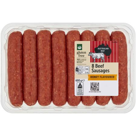 Australian Beef (70%), Water, Seasoning (Sugar, Potato Starch, Salt, Citrus Fibre, Honey Powder (4%), Mineral Salt (451), Maize Starch, Fructose, Brown Sugar, Vegetable Powders, Natural Flavours, Preservative (223 (Sulphites)), Antioxidant (Ascorbic Acid), Spice Extracts, Ginger, Herb Extracts, Humectant (422)), Vegetable Casing (Vegetable Gums (401, Guar Gum), Acidity Regulators (Citric Acid, Lactic Acid), Preservative (223 (Sulphites))), Mineral Salt (509)