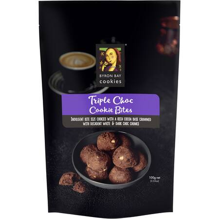 Byron Bay Triple Choc Cookie Bites are indulgent bite size cookies with a rich cocoa base crammed with decadent milk & dark choc chunks.<BR><BR>Baked to perfection in Byron Bay and crafted from one of Byron Bay Cookie Company's heritage cafe cookie recipes, these Triple Choc Cookie Bites will delight all cookie lovers with a generous mouthful of white and dark choc chunks. A taste of Byron in every bite!<BR><BR>Bite Size<BR><BR>Baked in Byron Bay