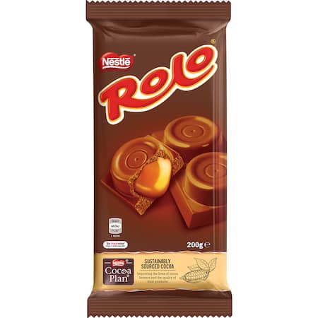 Savour a piece of the deliciously smooth and creamy Nestle Rolo Chocolate Block. Decadent milk chocolate cups filled with oozing, gooey caramel make for an indulgent treat sure to leave you satisfied. •Made with 100% certified sustainable cocoa, supplied through the Nestle Cocoa Plan•Recycle me! Return your wrappers in store through REDcycle. •Proudly made in our Australian factory, in Campbellfield, Victoria. •Suitable for vegetarians.