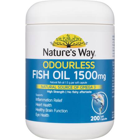 Nature’s Way Odourless Fish Oil 1500mg is completely free from any fishy odour with no artificial colours or sweeteners.
