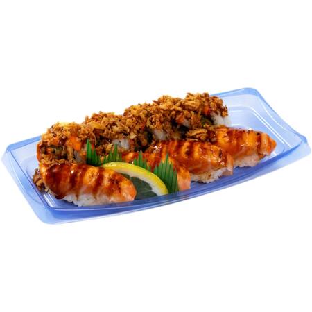 Sushi rice, salmon, spicy mayonnaise, sushi sauce, teriyaki chicken, cucumber, avocado, seaweed, fried onion