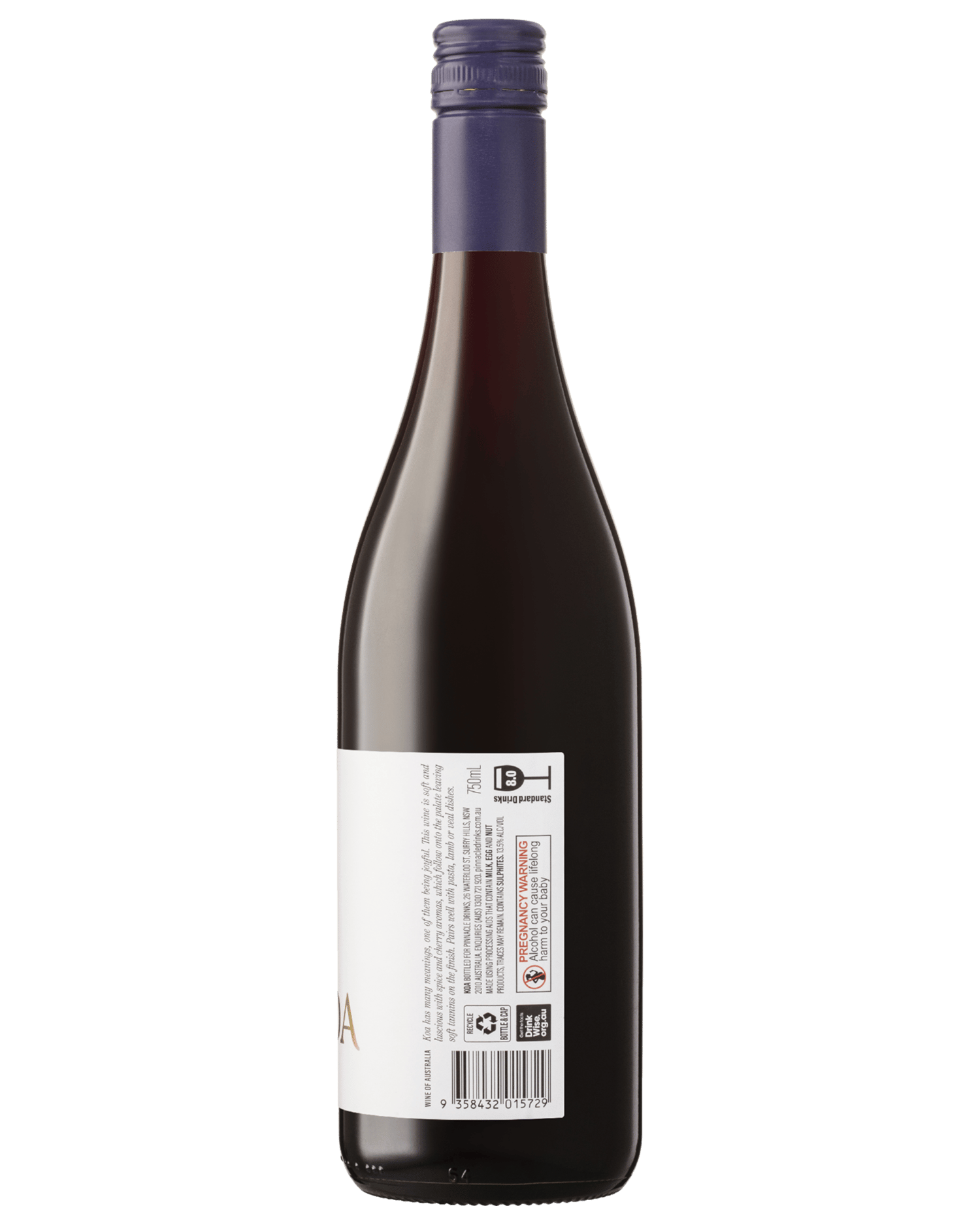 Koa has many meanings, one of them being joyful. The wine is soft and luscious with spice and cherry aromas, which follow onto the palate leaving soft tannins on the finish. Pairs well with pasta, lamb or veal dishes.