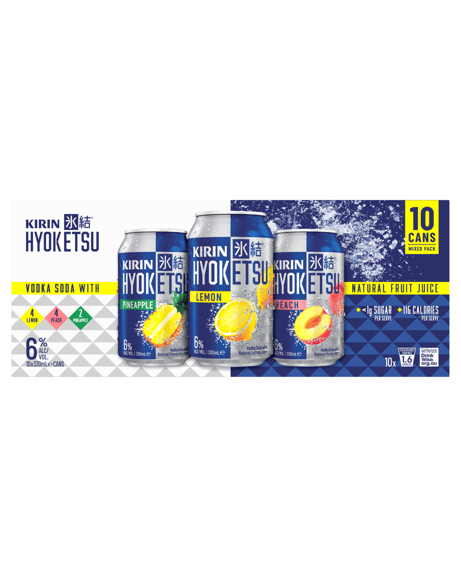Kirin Hyoketsu Mixed Pack? Hello, Yes! Lemon. Peach. Pineapple. Made from vodka, soda and frozen natural fruit juice, using Hyoten Toketsu technology to lock in the freshness and intensity of the natural fruit flavours. With only <1.0 grams of sugar and 116 calories per can, embrace something new. Say Hello, Yes! to the juicy flavour of a Kirin Hyoketsu.