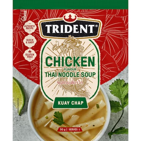Noodles (82%): Rice Flour, Water, Flavour Sachet: Salt, Sugar, Flavour Enhancers: (621, 635), Dried Leek, Artificial Chicken Flavour (0.4%) (Corn Protein, Hydrogenated Vegetable Fat, Soyabeans, Salt), Tapioca Starch, Curry Powder (Turmeric, Coriander, Cumin, Pepper, Cloves), Curry Flavour (Vegetable Oil, Curry Powder, Garlic), Chilli Powder, Colour: (100), Oil Sachet: Vegetable Oil, Garlic.